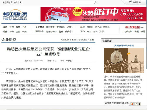 濰坊昌大建設集團榮獲“全國建筑業先進企業”榮譽稱號——中國工程建設網“企業動態”2