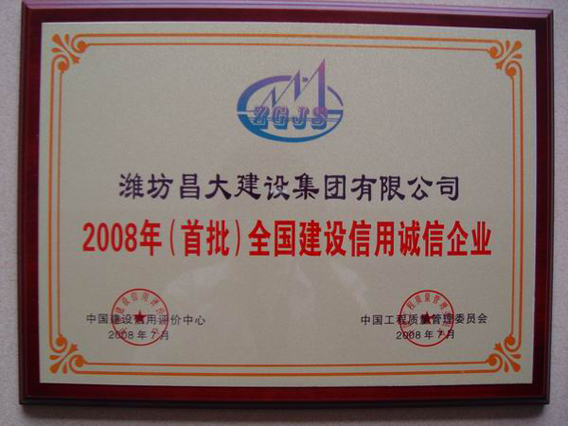 濰坊昌大建設集團被授予“2008年(首批)全國建設信用誠信企業”