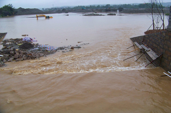 7月24日至25日,一場特大暴雨突襲北川新縣城,集團公司援建的多處工地受到影響。至25日凌晨,職工宿舍、辦公室、食堂等地方進水高達40cm,集團公司的援川人員,特別是第八分公司的員工及時展開自救。幾個小時內,大家先后將室內的物品轉移到高處沒有進水的房間,天一亮,指揮部便緊急組織工地搶險,大家分工協同,分別趕赴安昌河下游施工段和安昌河已驗收河段查看受災情況……由于指揮部早在20日就下達安昌河防防汛通知,各施工單位提前應對,從而保證在這次特大洪水來臨時,所有施工人員安全撤離、所有材料轉移(由于汛情超過預想,第八分公司安昌河下游施工段景觀濕地形成了大面積積水致使一些土方機械過水)。此次洪水來襲,已竣工的安昌河段安然無恙,第八分公司正在施工的安昌河下游溢流堰、擋水堰已經合攏,經受住了洪水沖擊。 ![]() 洪水中的施工現場