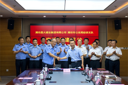 2023年5月18日上午,集團公司與濰坊市公安局經偵支隊黨建共建簽約暨服務工作站啟用儀式在集團總部辦公樓二樓視頻會議室舉行。集團公司紀委書記穆乃杰同志與經偵支隊政委于輝同志分別在《警企共建協議書》、《經偵支隊黨支部與昌大總部黨支部黨建共建協議書》上簽字;穆乃杰同志與市公安局經偵支隊支隊長張伯濤同志共同為經偵支隊昌大工作站揭牌。市經偵支隊副支隊長孫文卿、張樹文、李忠波、秘書科科長李波、經偵三大隊副大隊長王海濤、高新分局經偵大隊長高繼東、高新分局清池派出所所長別在勇,集團公司總部黨支部成員王忠義、付連慶、于宏勝、張煒、韓禎信以及法務部總經理高勇、副總經理張涵參加簽約活動。