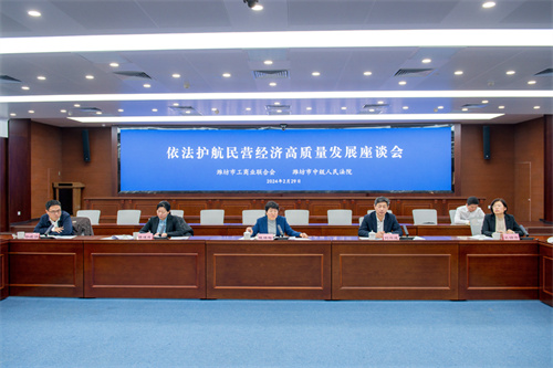 2024年2月29日上午,濰坊市依法護航民營經濟高質量發展座談會在濰坊市中級人民法院會議室召開。市政府副市長、市工商聯主席陳端梅,市委統戰部副部長、市工商聯黨組書記劉興成,市工商聯黨組成員副主席譚述霞出席會議。市委政法委、市工商聯相關工作人員,商會會長代表、企業家代表、民營企業法務中心代表參加會議。集團公司總裁朱九洲出席會議并作交流發言,代表企業家感謝市中院及法院系統在依法護航企業發展過程中給予的支持,同時建議法院系統繼續依法對民營企業提供法律保護等。