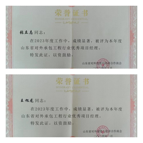 2024年3月12-13日,山東省對外投資與經濟合作商會舉行行業發展交流大會,并對2023年度商會先進單位和個人進行表彰,集團獲“二〇二三年度山東省對外承包工程行業先進單位”榮譽稱號,海外公司張立志、王旭龍獲“山東省對外承包工程行業優秀項目經理”榮譽稱號。