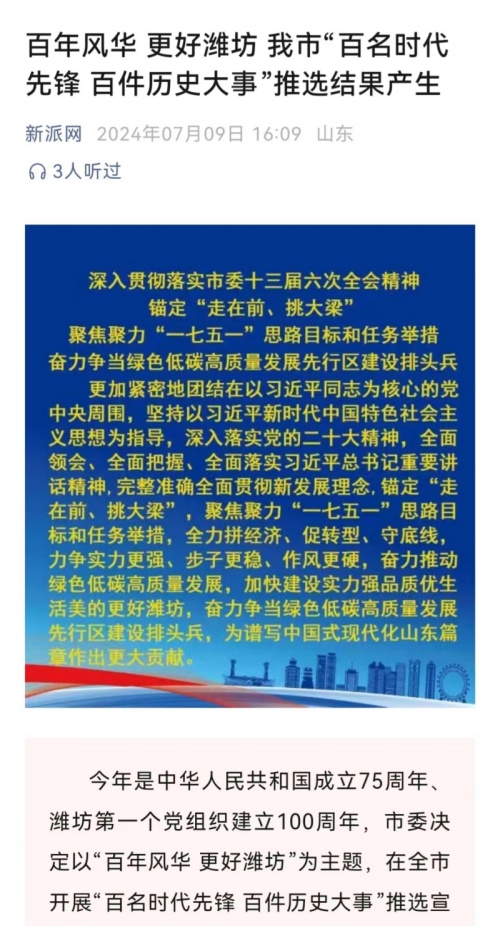 近日,由濰坊市委決定以“百年風華、更好濰坊”為主題,在全市開展的“百名時代先鋒、百件歷史大事”推選宣傳活動,經過廣泛征求各方面意見、組織推薦、投票推選等,“雙百”推選結果產生。